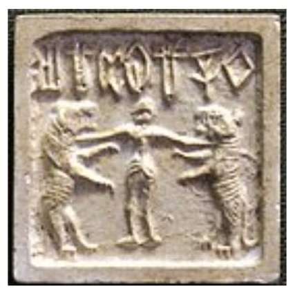 Indus valley civilization seal, with man fighting two tigers (2500-1500 BCE).